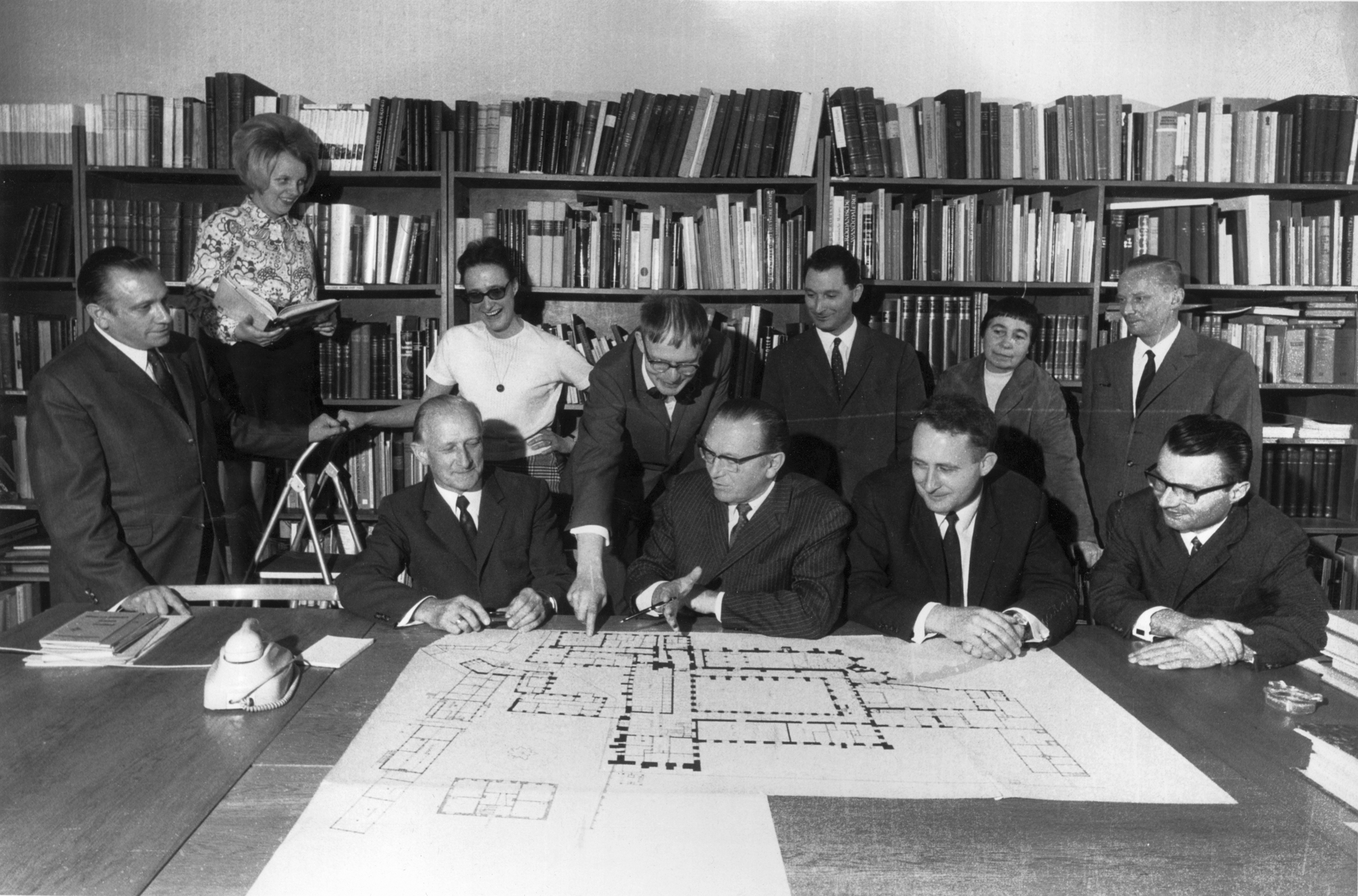 Planungsbesprechung mit Denkmalpflegerinnen und Denkmalpflegern in Hannover zum Kloster Lüne in den 1960er-Jahren