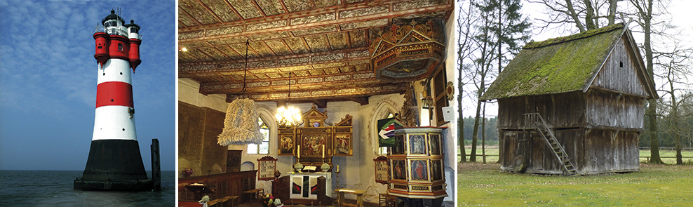 Links Leuchtturm Roter Sand. Mitte Basdahl-Oese, Gutskapelle und rechts Hermannsburg, Treppenspeicher.